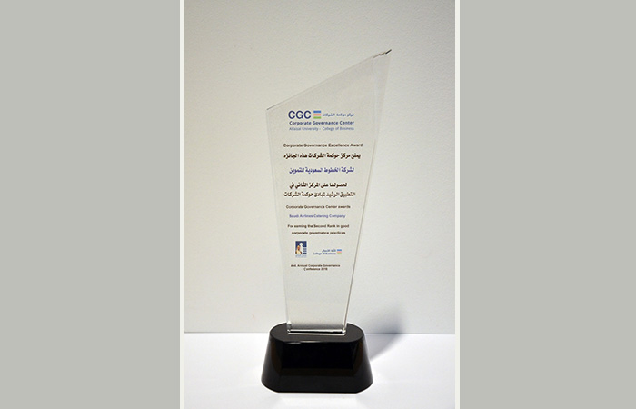 Saudi Airlines Catering Company received a prestigious award at the annual Corporate Governance Conference, organized by the Corporate Governance Center at Alfaisal University - College of Business, in collaboration with the Capital Markets Authority, the Saudi Arabia General Investment Authority, and the Ministry of Commerce and Investment. Saudi Airlines Catering Company was ranked second amongst the top five best companies in the Kingdom that scored highest according to the Corporate Governance Index (CGI) in which 171 listed companies in the Saudi Stock Exchange participated. This recognition culminates the company's best practice standards in corporate governance.