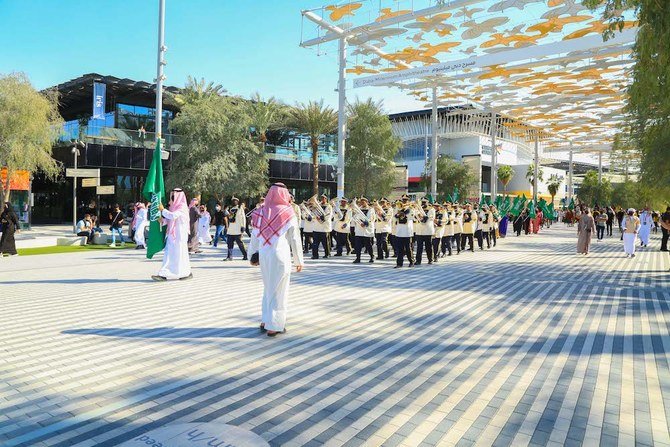 The parade on Al-Ghaf Avenue, in front of the pavilion, was led by 80 members of a military band playing trumpets and drums. It also included women in traditional and contemporary Saudi dress, and men on horseback representing the Kingdom’s rich equestrian traditions.