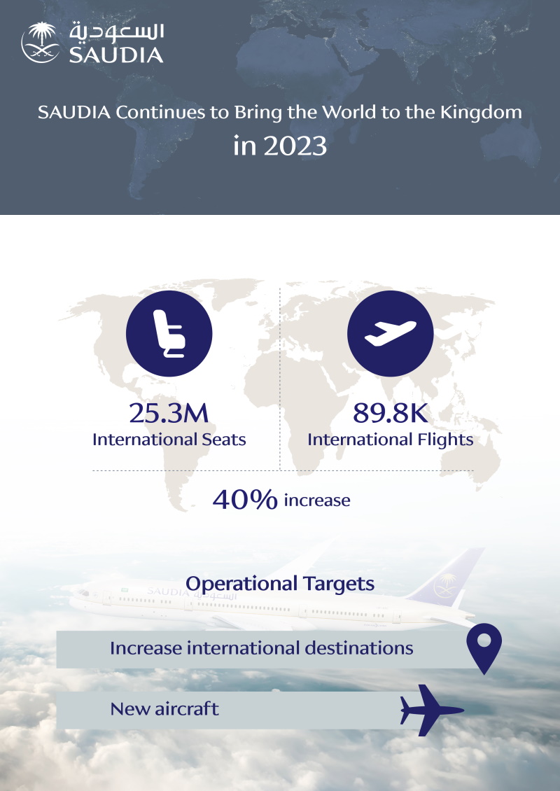 SAUDIA has allocated over 25.3m seats for international flights in 2023 across almost 90,000 flights, up 40% from 2022. Similarly, seating capacity on domestic flights for 2023 has been increased by about half a million seats to reach over 17.8m seats, with the total number of domestic flights exceeding 102,100. The update to the company’s flight schedule and operations are designed to meet growing customer demand and further increase convenience in flight schedules throughout the year, and in particular during demand-peak seasons.