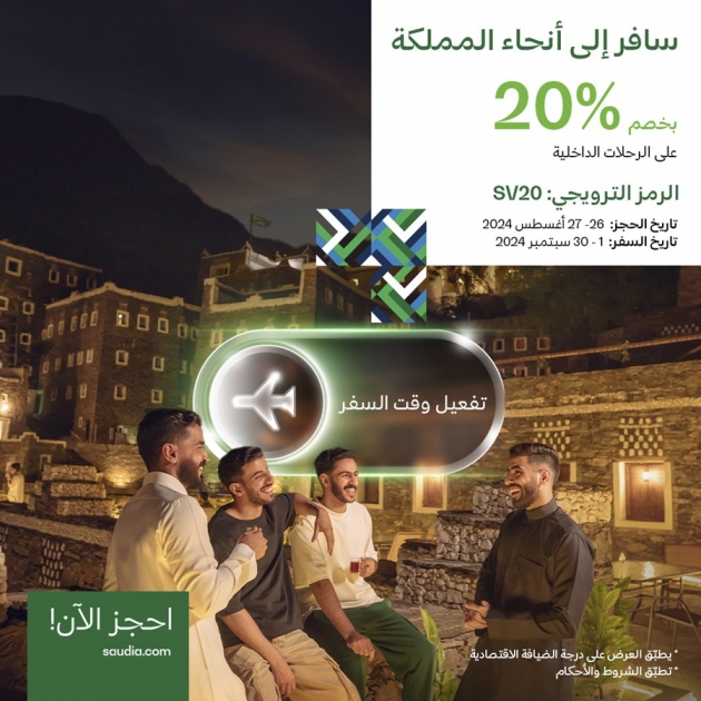 Saudia, the national flag carrier of Saudi Arabia, is offering a 20% discount on flights between its domestic destinations. This special promotion is part of Saudia’s ongoing efforts to enhance guest loyalty through various initiatives.