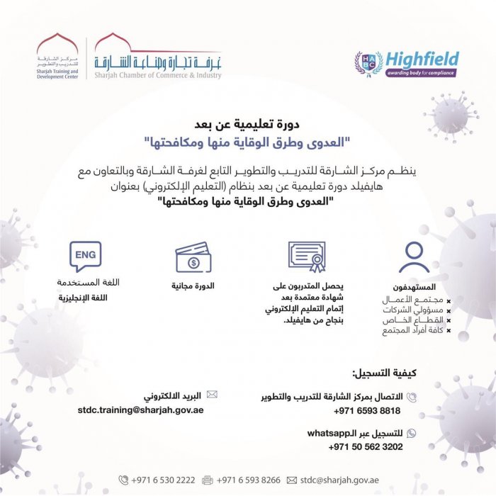 The Sharjah Chamber of Commerce & Industry, SCCI, represented by the Sharjah Training & Development Center (STDC), has recently launched an online course on the “infection and ways to prevent and combat it”.