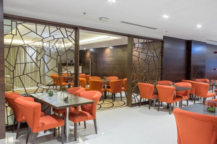 It encompasses 785 rooms and suites, individually controlled air condition, electronic door locks, in-room electronic safe box, iron & ironing board, LED HD TV, major satellite channels, mini fridge, praying mats, international direct dialing, hair dryer, magnifying glasses in bathrooms. The hotel has two ballrooms that can accommodate more than 500 guests for any event and three meeting rooms. There are three restaurants, Tasneem, Al Multaqa and M Café.