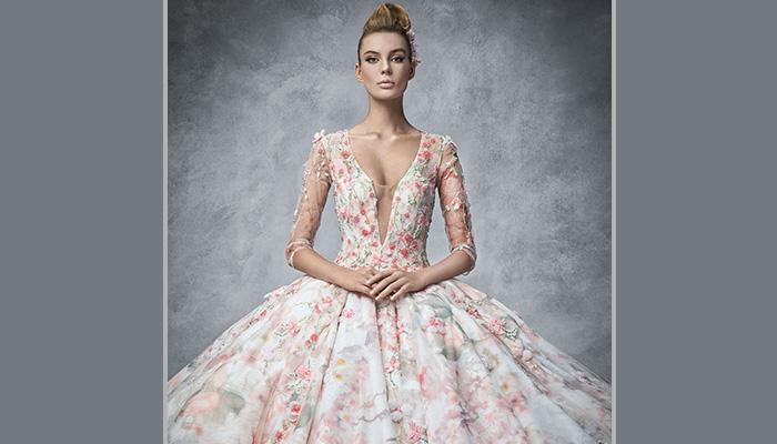 The crystal-embellished, deep-V mesh gown with a flouncy skirt that is embroidered with carnations and lilies signifying the lovely auspice of the most beautiful day of the bride’s life. The silky texture coupled with a weave of the smoothest mesh adorned with real Swarovski crystals makes this show-stopping gown a truly magical and mesmeric affair. Bella Reve also offers a wide range of eclectic mix of patterns, prints and texture with beautiful fabrics for this season in silk chiffon, silk shantung, velvet, brocade, algoddon and crepe de chine.