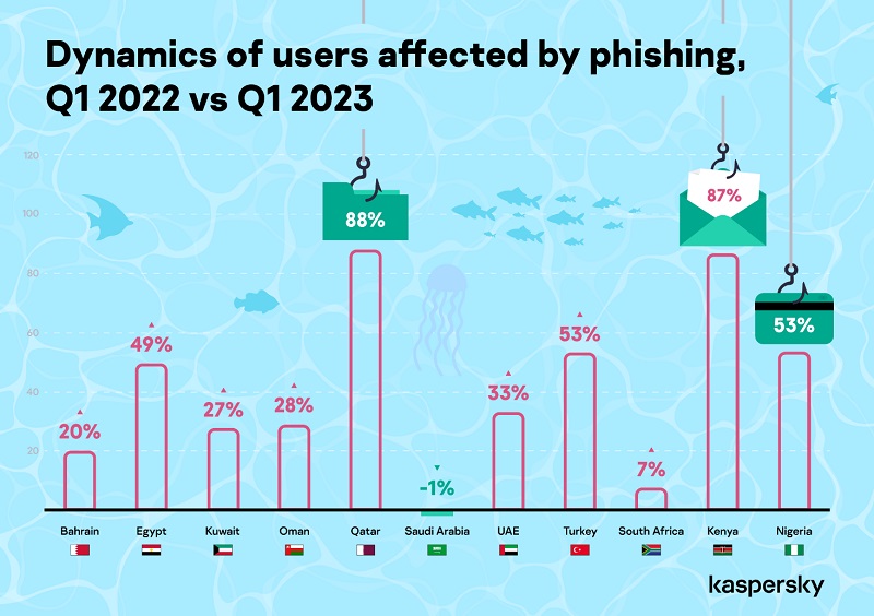 In the African region, phishing attacks grew in South Africa (7%), Nigeria (53%) and Kenya (87%) in Q1 of 2023 as compared to Q1 of 2022. Turkey (53%) witnessed an 53% increase in Q1 of 2023 as opposed to Q1 2022.