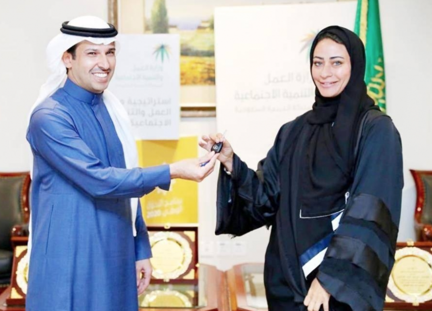 Hanan Hamid Saleem, the first woman field inspector employed by the Ministry of Labor and Social Development, receives the keys to the new car she was given to help her do her job in inspecting violations in the labor market. Sattam Al-Harbi, undersecretary for inspections and development at the ministry, handed the car keys to Hanan.