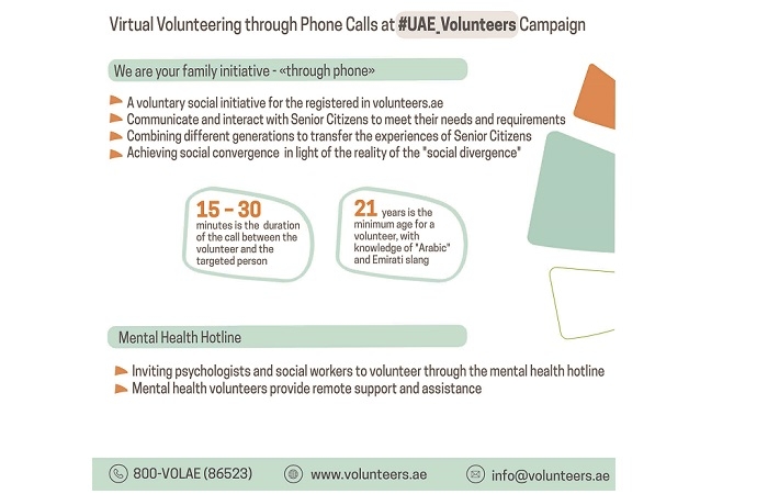 The National Campaign "UAE Volunteers" launched two hotlines to communicate with the members of the community through the virtual volunteering giving the opportunities for both Emiratis and residents to promote social participation, cooperation and solidarity as part of the national efforts to fight the spread of novel coronavirus-COVID 19.