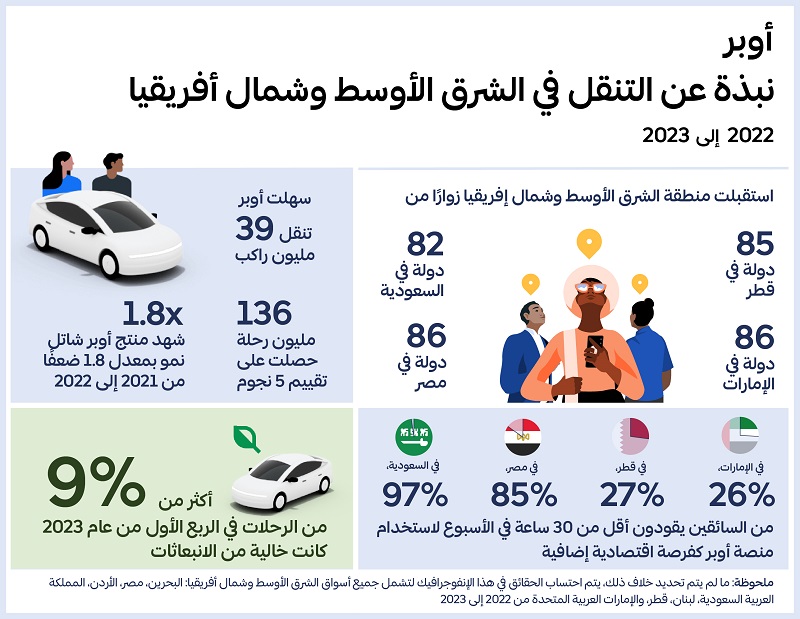 The data also showed the continuous need for flexible economic opportunities that enable drivers to attend to other commitments and have multiple flexible sources of earnings, especially during the current challenging global macro economic conditions. Out of the all drivers who use the platform, 85% in Egypt, 97% in KSA, 26% in the UAE, and 27% in Qatar drive less than 30 hours per week using the Uber platform as an additional economic opportunity.