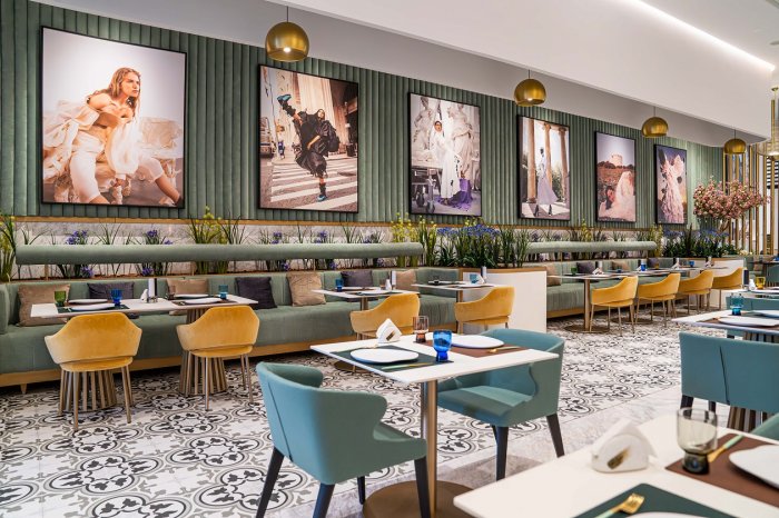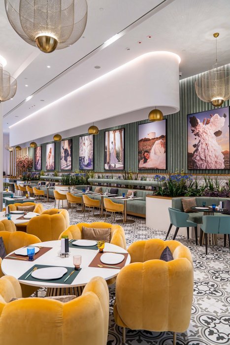 Decorated throughout in mineral greens and pale yellows, signature mesh chandeliers, Arabic tiling, and featuring iconic and bold photography from the global archives of Vogue, emphasizing Vogue Arabia, Vogue Cafe Doha is set to offer the chicest dining experience in the city.