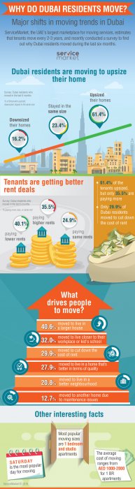 With residential rental rates in Dubai on the decline, the moving market has been reshaped by a large degree over the last couple of years. ServiceMarket, the UAE's largest marketplace for moving services, estimates that tenants move every 2-3 years, and recently conducted a survey to find out why Dubai residents moved during the last six months. The study revealed several major shifts in moving trends in Dubai. Here are some of the interesting and surprising findings to help you understand the main reasons for why Dubai residents decided to move.