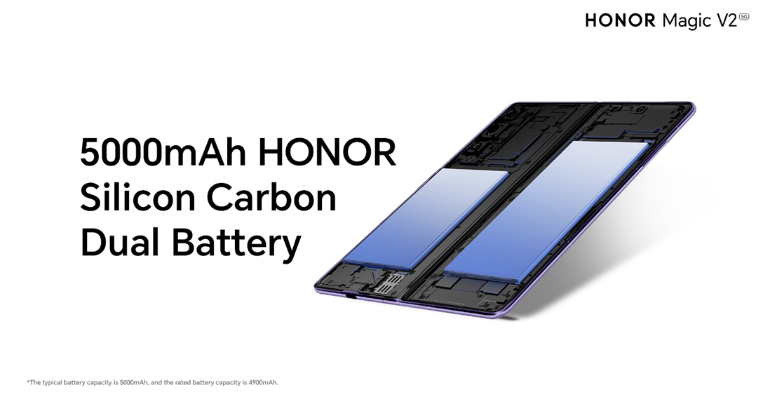 Featuring the thinnest dual Silicon-carbon Batteries, with an average thickness of just 2.72mm, and boasting a substantial 5000mAh capacity, the HONOR Magic V2 ensures users stay connected without the need for frequent recharging.